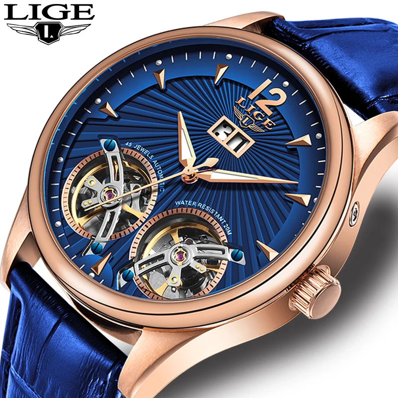Promo Watch Men 2019 New LIGE Blue Leather Double Tourbillon Mechanical Mens Watches Top Brand Luxury Aut